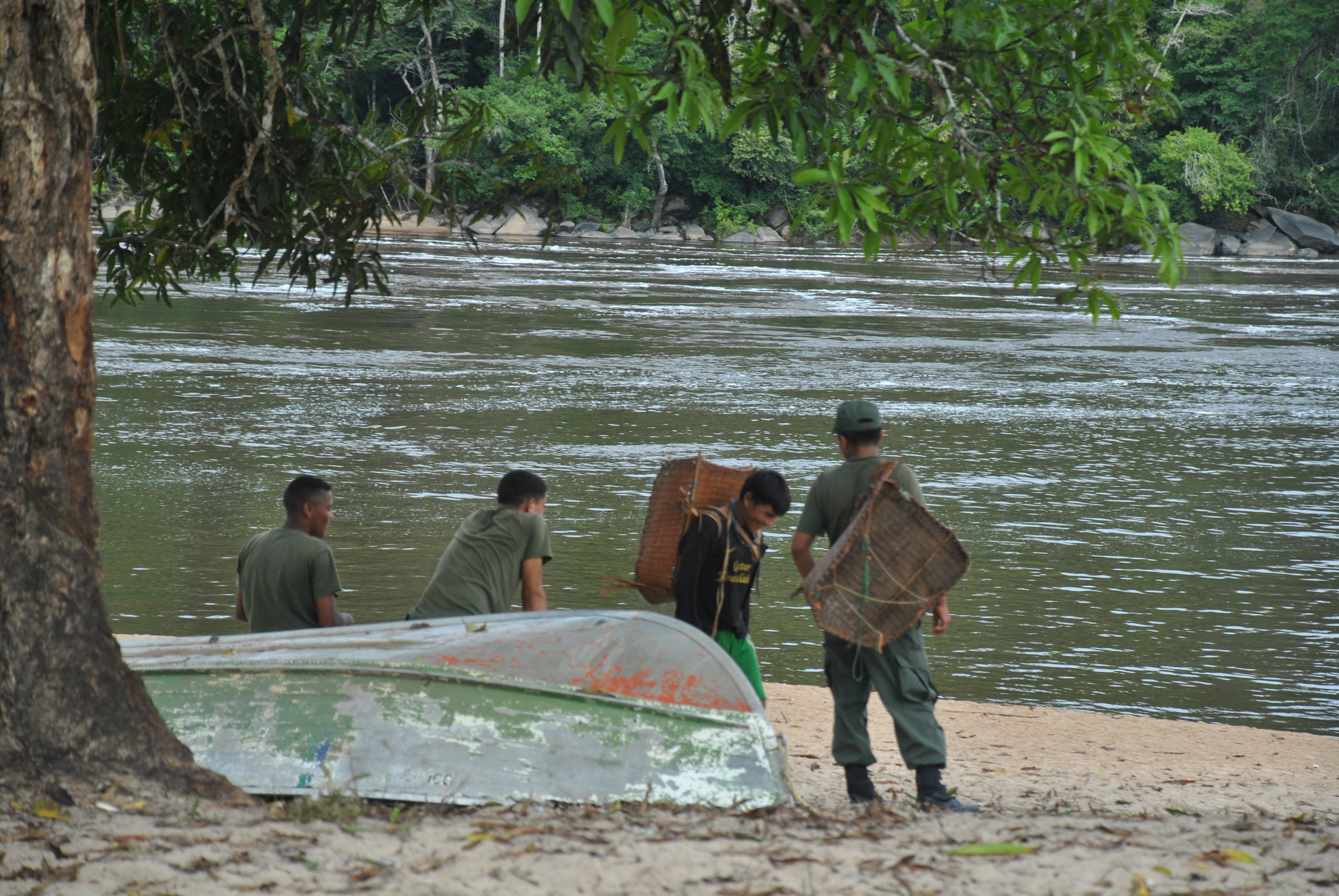 Nouveau départ, nouvelle équipe. Parmi nous, le chauffeur, un jeune couple Ye’kuana (dont notre guide local) et leur bébé de 6 mois, ainsi que la mère du guide qui aidera Marun à faire des courses de dernière minute pour la suite de notre périple sur le Caura.