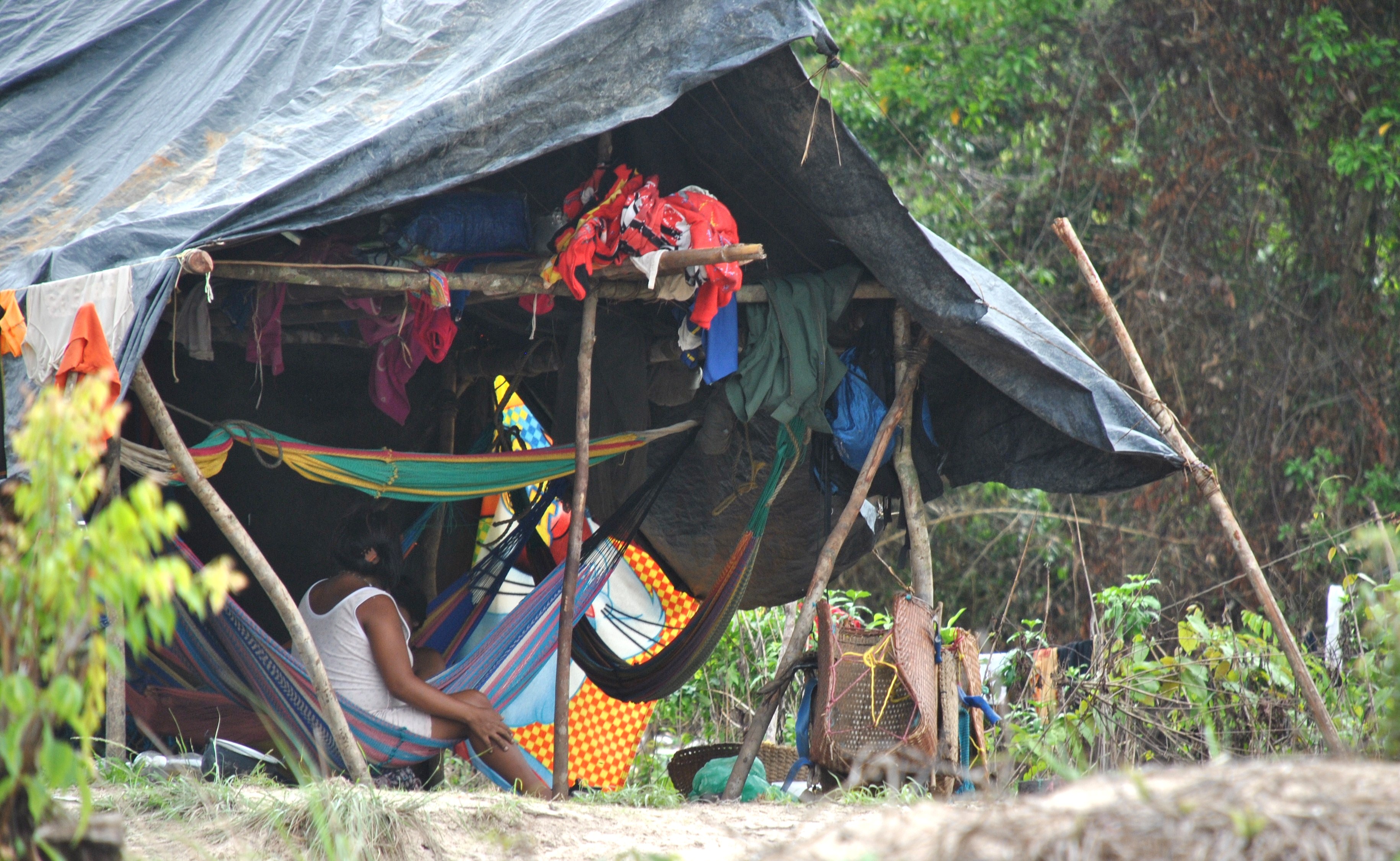 Le carbet est parfaitement aménagé, équipé de toilettes et pourvu d’un groupe électrogène. Sous une case ronde au toit entièrement tressé main, sont suspendus en cercle nos hamacs sous de larges moustiquaires. Sous un autre carbet, nos accompagnateurs Ye’kuana ont installé et déballé nos vivres.