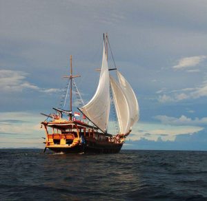 Naviguant dans les archipels oubliés d’Indonésie, aux confins de la Micronésie, cette goélette de charme au nom exotique et tout de bois conçue, se faufilait parmi les falaises karstiques recouvertes de végétation primaire avec fière allure.