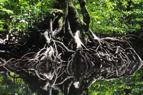Avec le soleil, le bateau file sur une mer d’huile. La zone de mangrove s’ouvre sur une large baie maritime. Aucun bateau à l’horizon pour nous cacher le paysage. L’impression d’être seuls au monde nous donne des ailes.