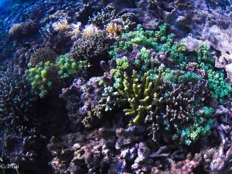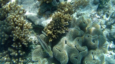 Nous nous jetons à l’eau à quelques centaines de mètres d’un minuscule îlot. Grâce à une extrême luminosité, la barrière de corail revêt des dégradés de couleurs fabuleux.